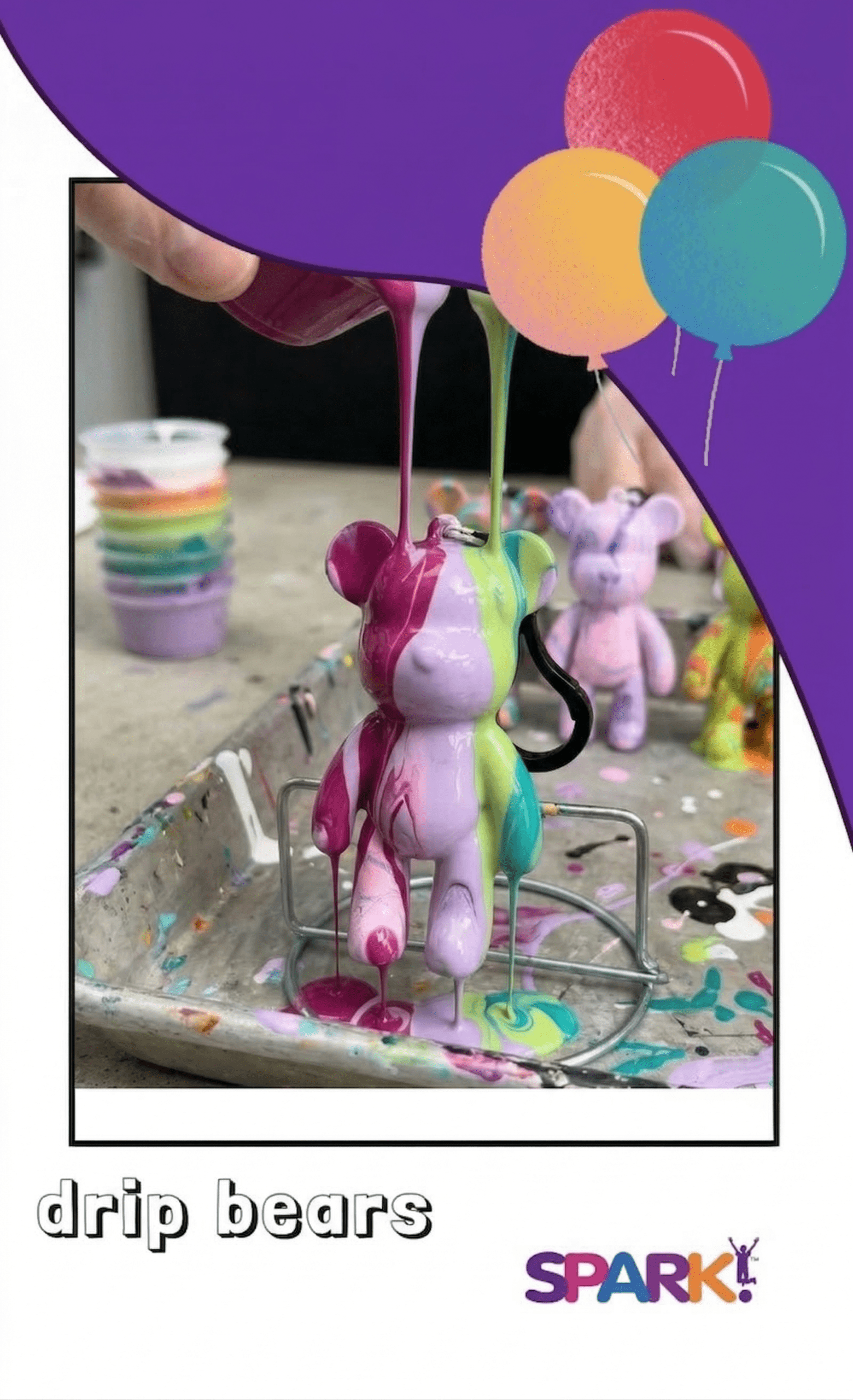 Drip bears are a totally unique and exciting birthday activity that combines art, color, and a little bit of magic! Watch as vibrant layers of resin drip and swirl over adorable bear-shaped molds, creating eye-catching designs that are completely one-of-a-kind.