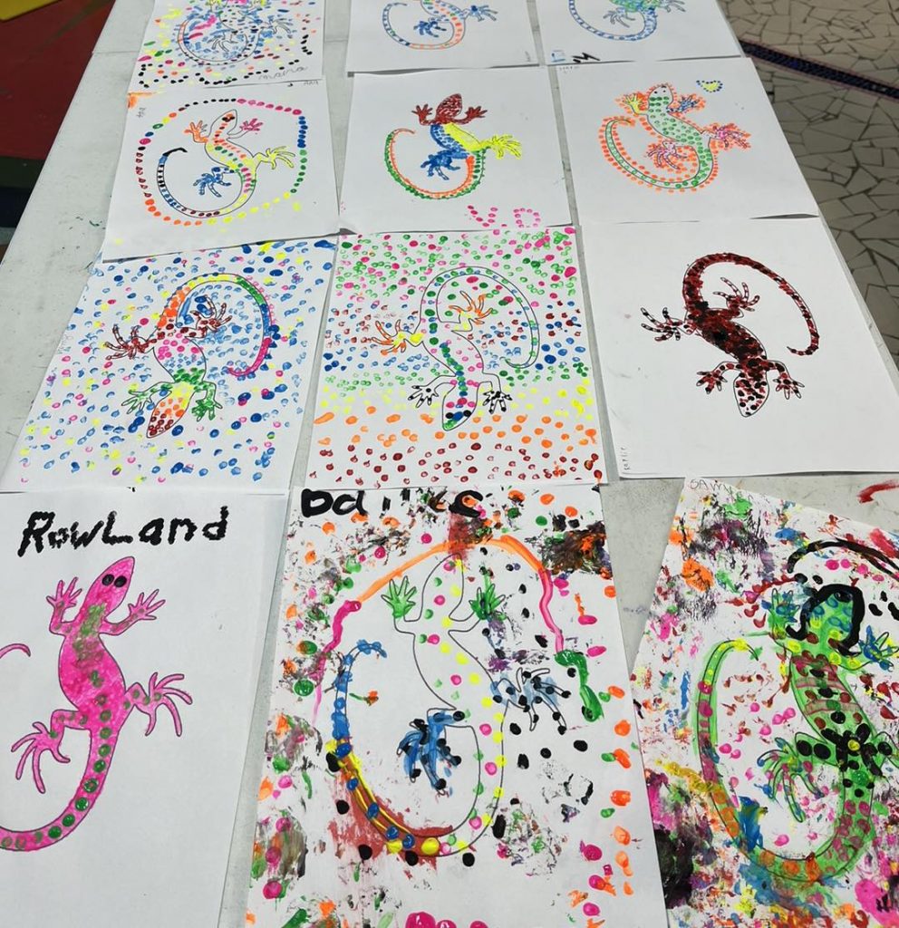 Aboriginal Dot Art allows participants to learn social studies skills by creating visual materials as a form of expression through dot art and iconic symbols. Participants learn about animals that live in Australia including kangaroos, lizards, koalas and platypus, and how Aborigines used dots and symbols to create original artwork and stories.