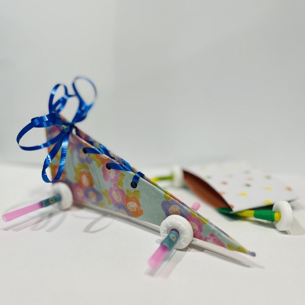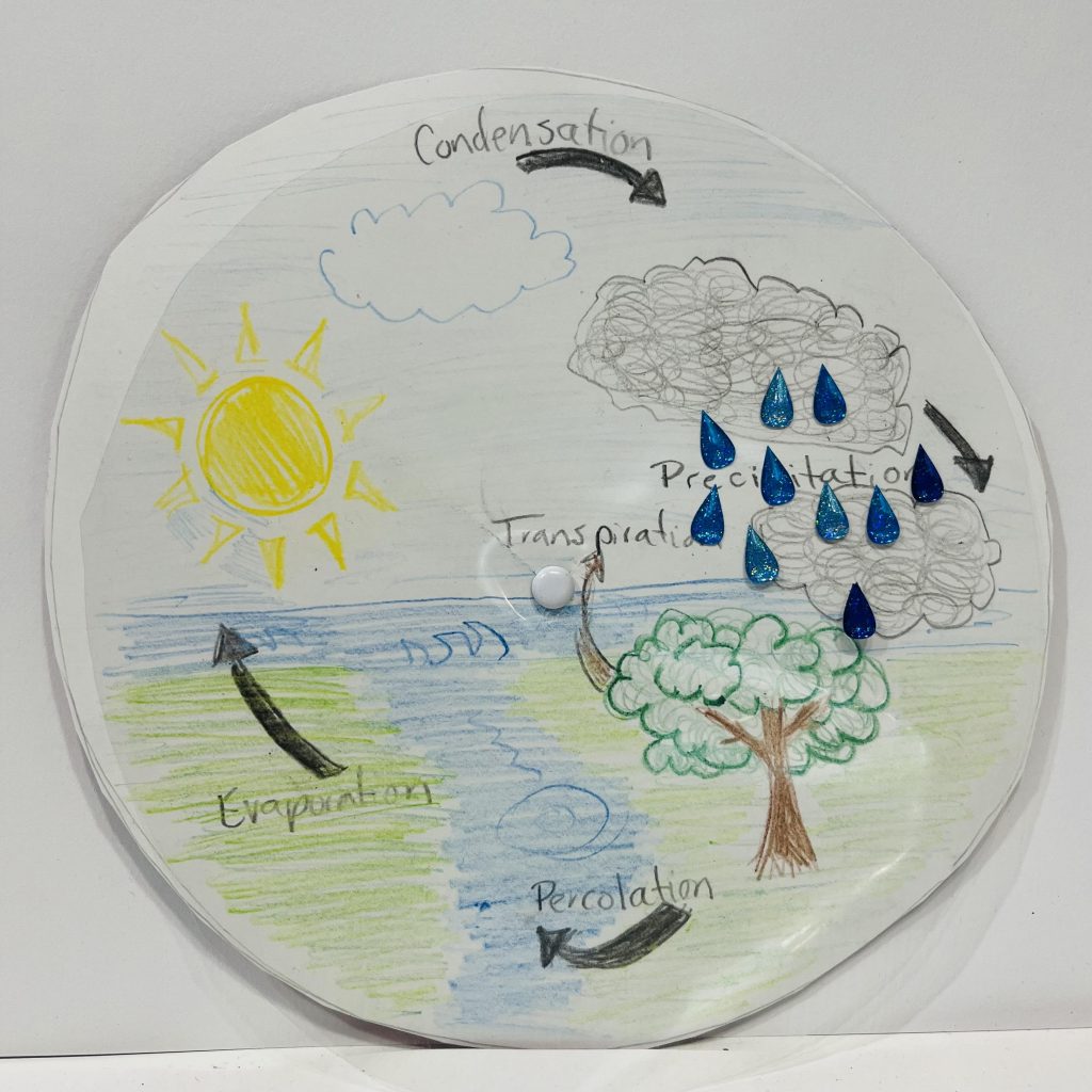 Water Cycle Spinners teach a recognizable pattern in the natural world on Earth. Participants review the different stages of the water cycle – precipitation, accumulation, evaporation, transpiration, and condensation – and create creative expression drawings of each phase. After finishing each phase, participants transform their phases into a spinner with a transparent spinner with sparkling, moving “water droplets.”